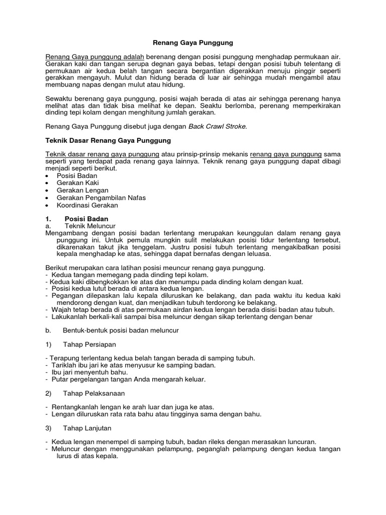 Untuk mempertahankan posisi tersebut, ada beberapa hal yang perlu diperhatikan : Kedua tangan secara bergantian digerakkan jauh ke arah depan dengan gerakan tangan perenang mengayuh secara bergantian , sementara kedua kaki secara bergantian dikibaskan naik turun ke atas dan ke. Dada, bahu, dan panggul berada di dalam air b. Sebenarnya, gaya punggung tidak begitu sulit asalkan kita berani dan rileks saat mencobanya.