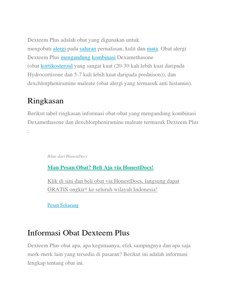 Dexteem plus adalah obat kombinasi kortikosteroiddexamethason dan antihistamin dexchlorpheniramin.obat ini tersedia di apotik dengan harga yang relatif terjangkau, hanya rp448.