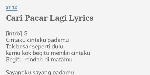 50+ St12 Cari Pacar Lagi Lirik. verse 1 cintaku, cintaku padamu tak besar seperti dulu kamu kok begitu menilai cintaku begitu rendah di matamu. Lirik cari pacar lagi dari st12 ini dipublikasikan pada tanggal 17 mei 2008 (13 tahun yang lalu).