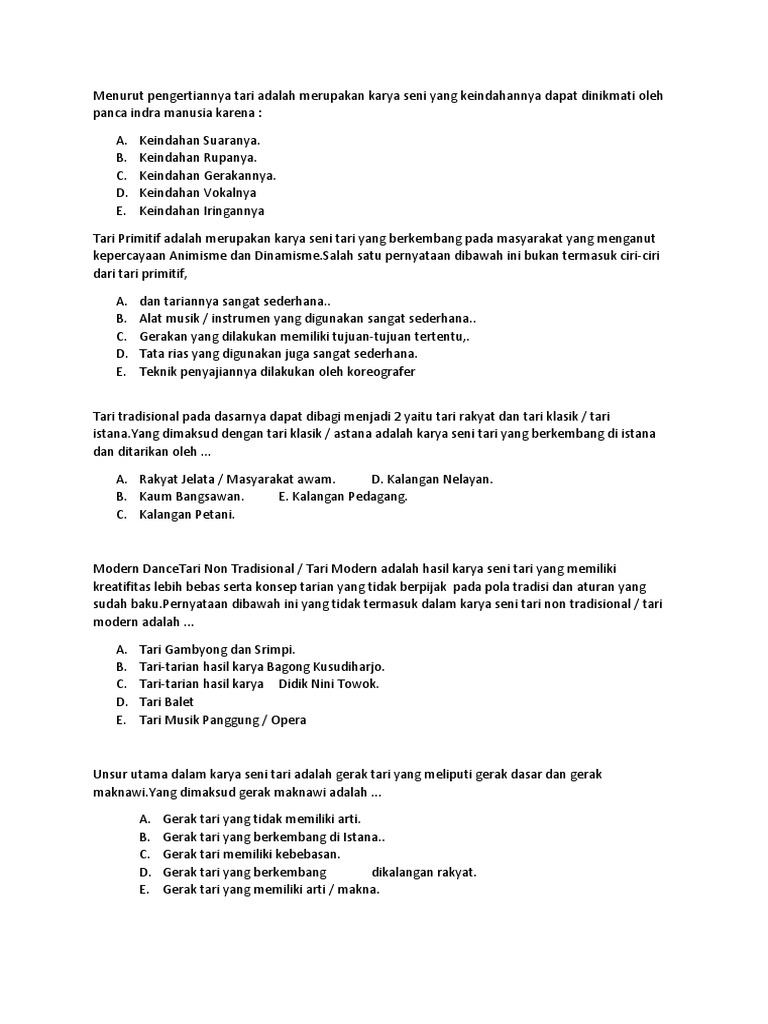 Tari adalah gerak tubuh secara berirama yang dilakukan di tempat dan waktu tertentu untuk keperluan pergaulan, mengungkapkan perasaan, maksud, dan pikiran. Tari primitif, merupakan tari tradisi yang menunjukkan gerak tari yang sederhana, yang terdiri dari. Soenartomo tjondroradono pada tahun 1976 yang mana pada tahun. Gerak dalam seni tari berfungsi untuk.